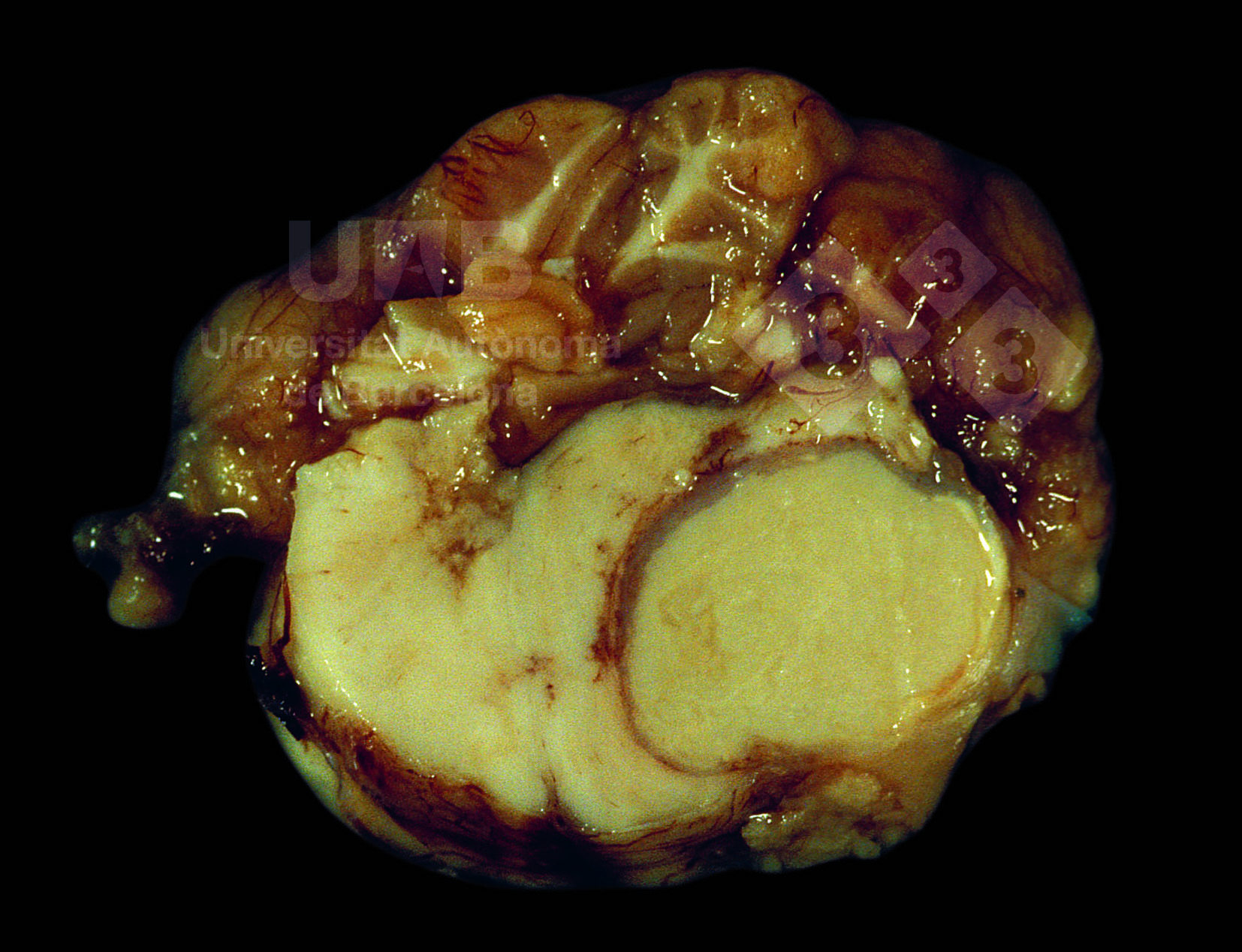 Esta lesão corresponde a um abscesso, que é um foco nodular de material purulento e necrótico rodeado por uma cápsula fibrosa. Os abscessos, em qualquer localização, são causados por infecções bacterianas. O abscesso da foto está no tronco cerebral, provavelmente como consequência da extensão da infecção bacteriana de uma otite interna.