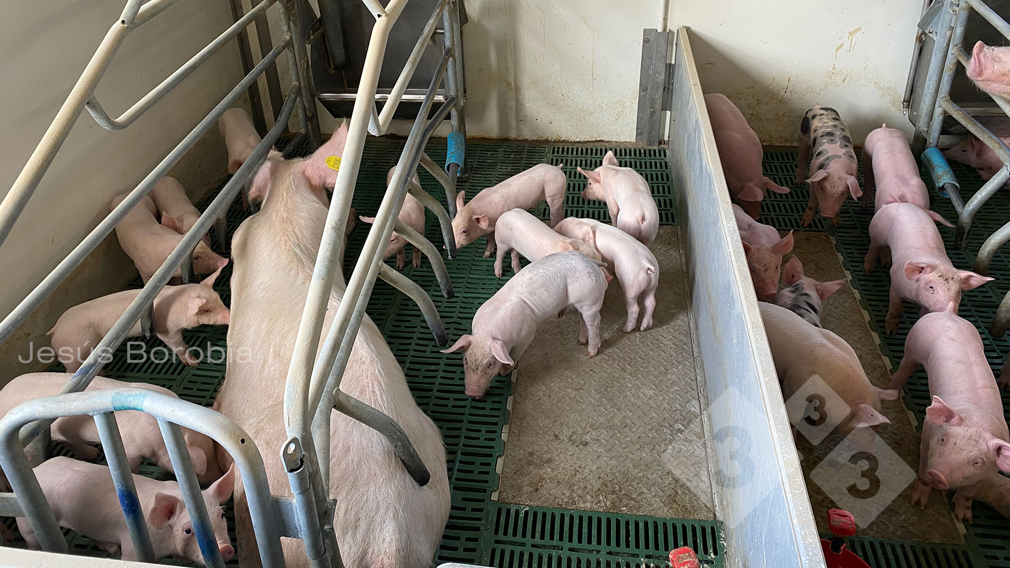 Toda a ninhada da esquerda está muito pálida em comparação coa a da direita (estes leitões são desmamados hoje, com 28 dias de idade).