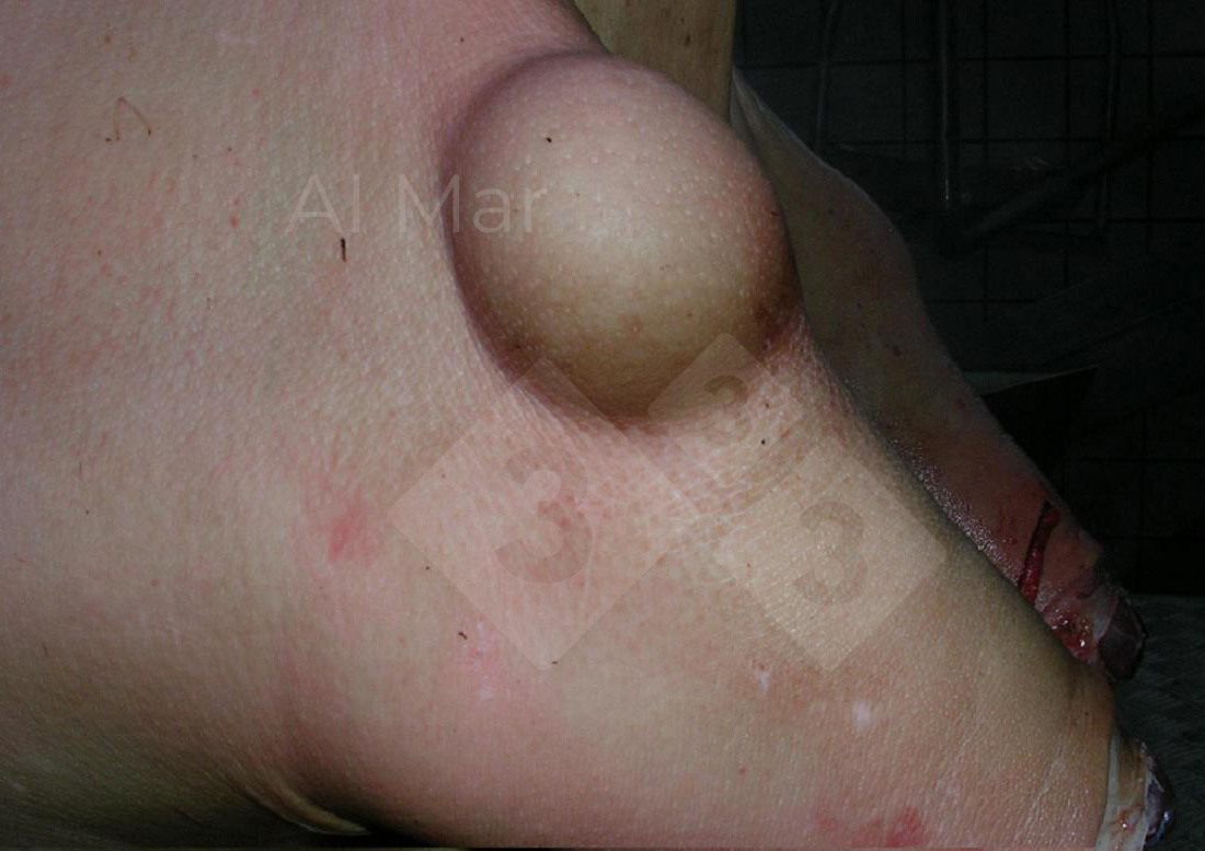 A artrite serosa manifiesta-se, neste caso, como uma inflamação na articulação do cotovêlo com uma forma e tamanho de uma bola de ténis. Ao realizar um corte na lesão, aparece um líquido fluido e transparente, que são características normais do líquido sinovial.