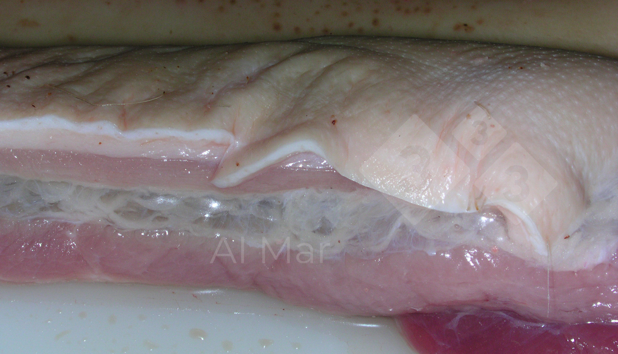A lesão observada neste porco, após abate, é um edema na zona abdominal entre os músculos oblíquos externos e internos. A causa do edema é a retenção de líquidos no espaço intersticial da zona afectada, neste caso na região abdominal.