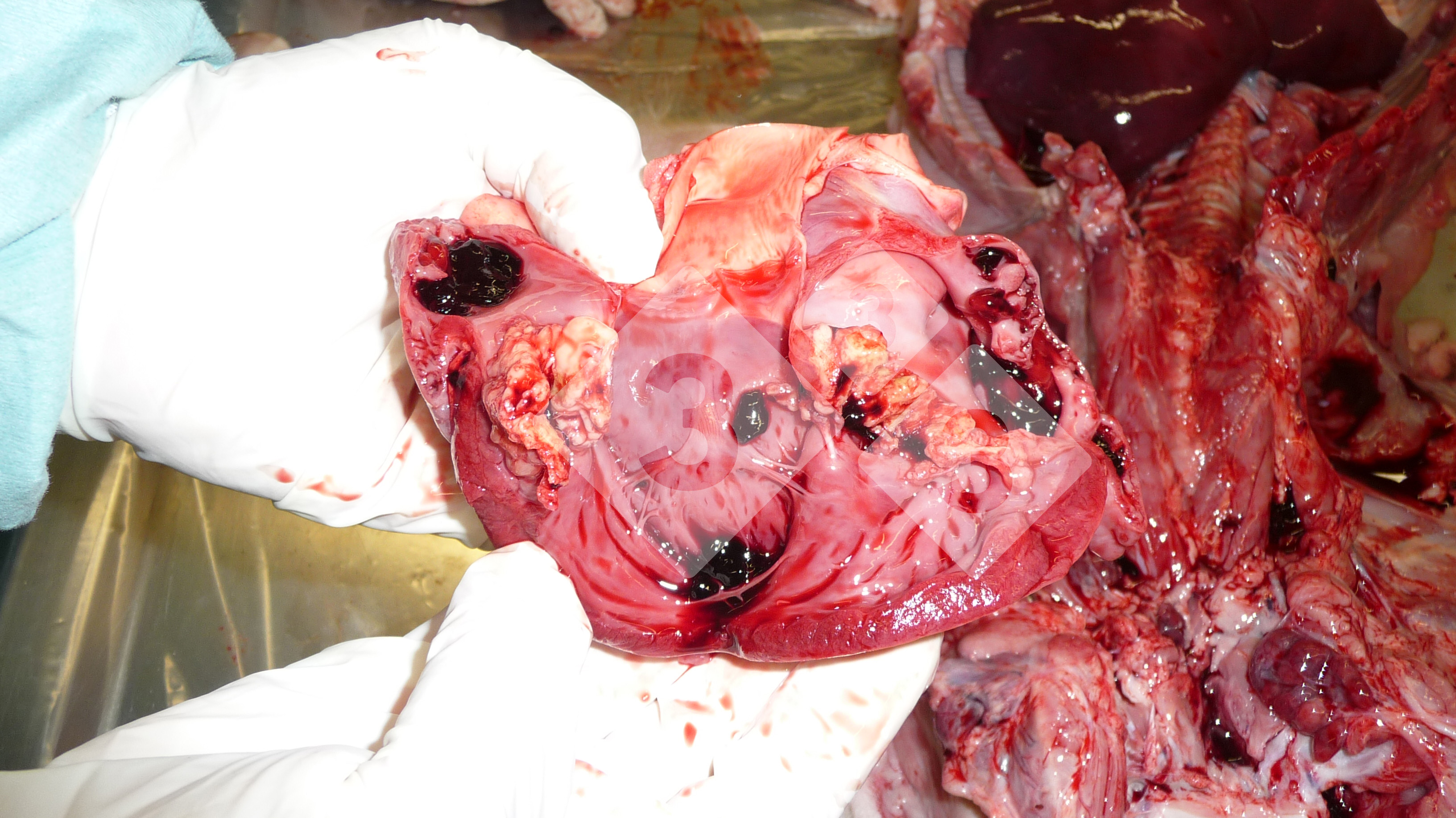 A endocardite define-se como uma inflamação do endocárdio cardíaco. A infecção pode afectar as válvulas (endocardite valvular) e disseminar-se desde aí até à parede cardíaca (endocardite mural). Costuma ser o resultado de uma bacteriémia ou piaémia. Os organismos mais comummente isolados são o Streptococcus suis e a Erysipelothrix rhusiopathiae. A Erysipelothrix rhusiopathiae foi o que se isolou neste caso.