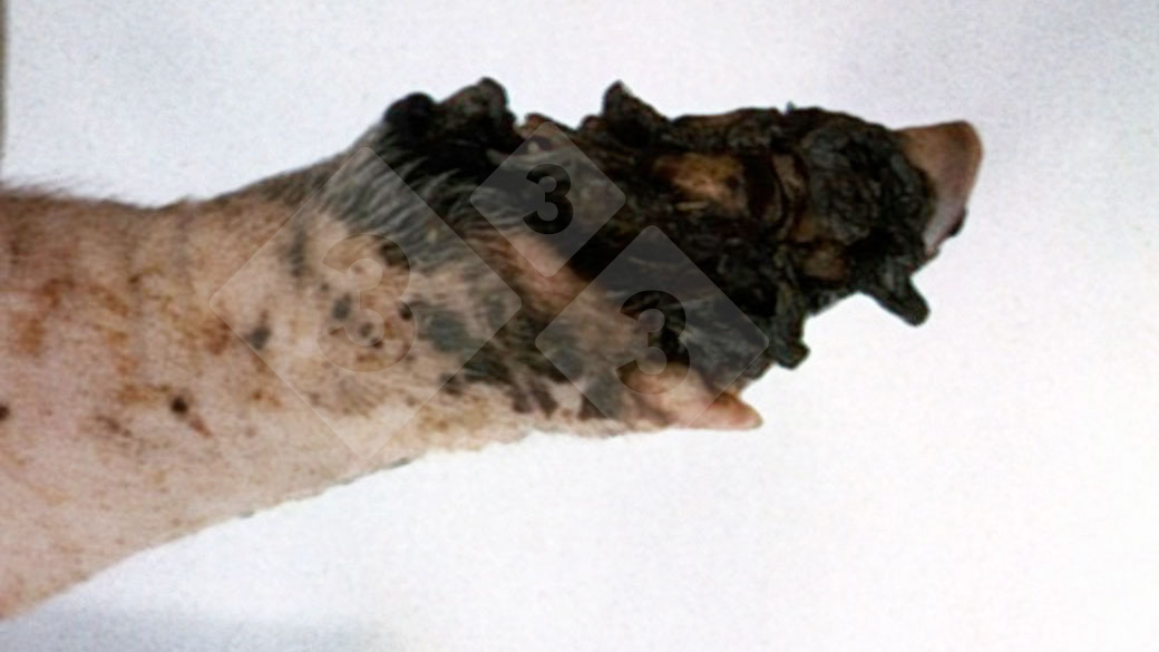 Uma única extremidade afectada também poderia ser devido a ter-se enrolado alguma coisa nessa pata e ter impedido a circulação; é improvável que o canibalismo dos seus companheiros de ninhada produza uma lesão seca desta natureza a não ser que estivesse extremamente avançada e que, depois, tenha começado a recuperar.
