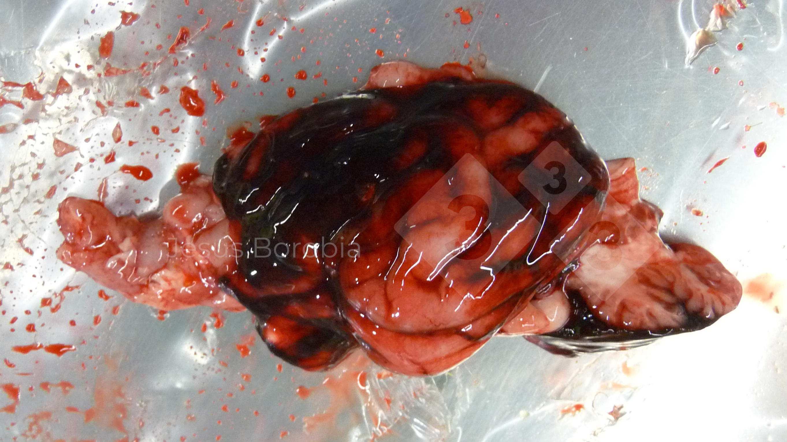 Este cérebro está envolto num coágulo em consequência de traumatismo craniano provocado ao eutanasiar o leitão.