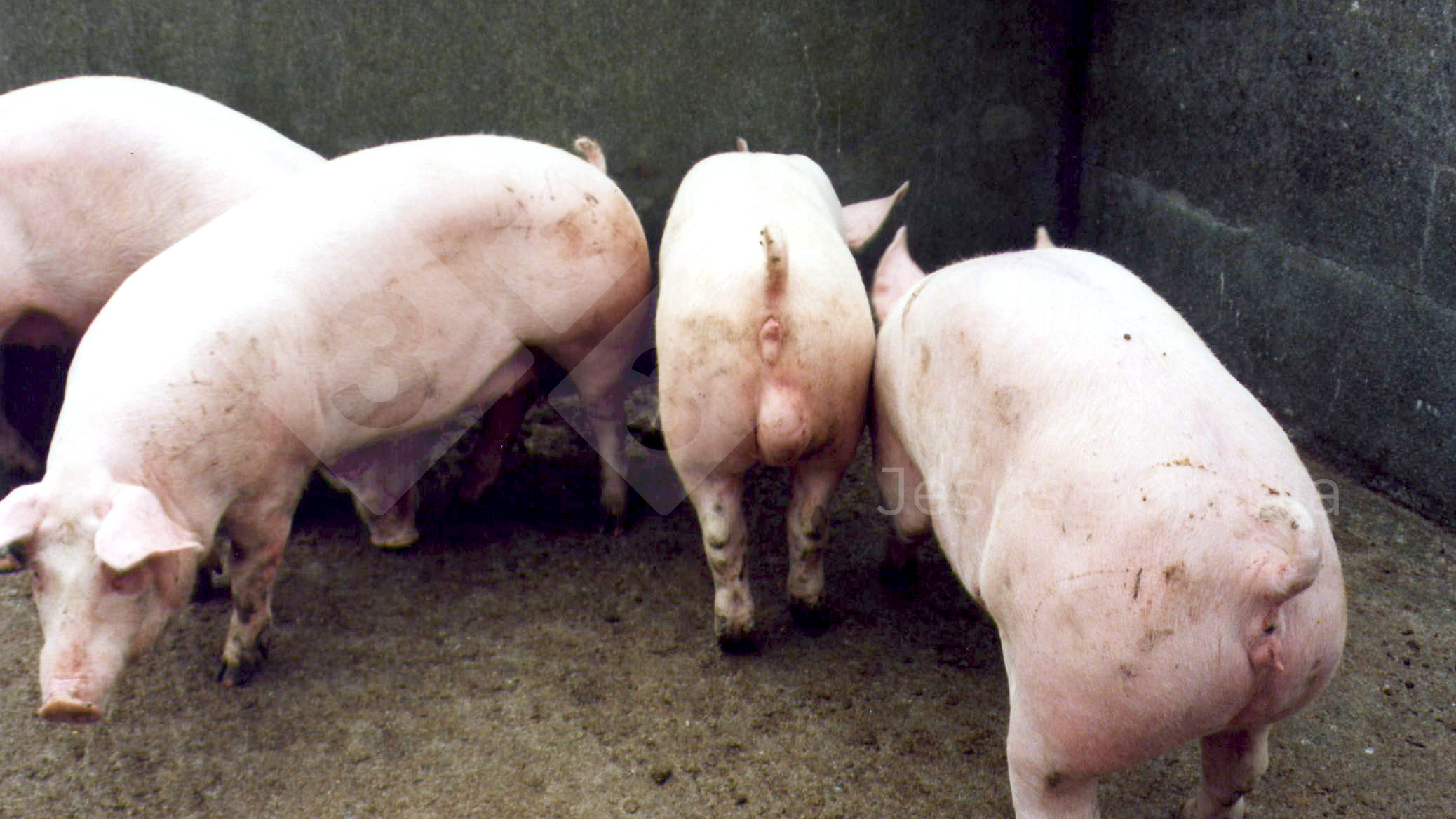 O hermafroditismo é uma condição de origem genética na que os órgãos sexuais têm características de ambos sexos. Neste caso, o segundo porco a contar da esquerda tem uma vulva e, abaixo, um testículo.