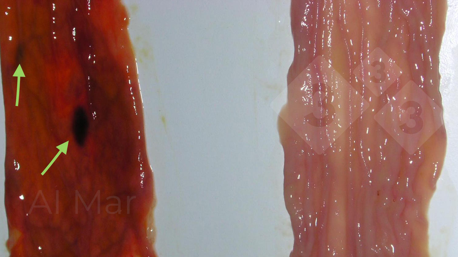 A lesão é observada no intestino delgado de um porco de engorda após o abate, na região do íleon, trata-se de um avermelhamento da mucosa com uns micro-enfartes repartidos de forma dispersa por todo o intestino.