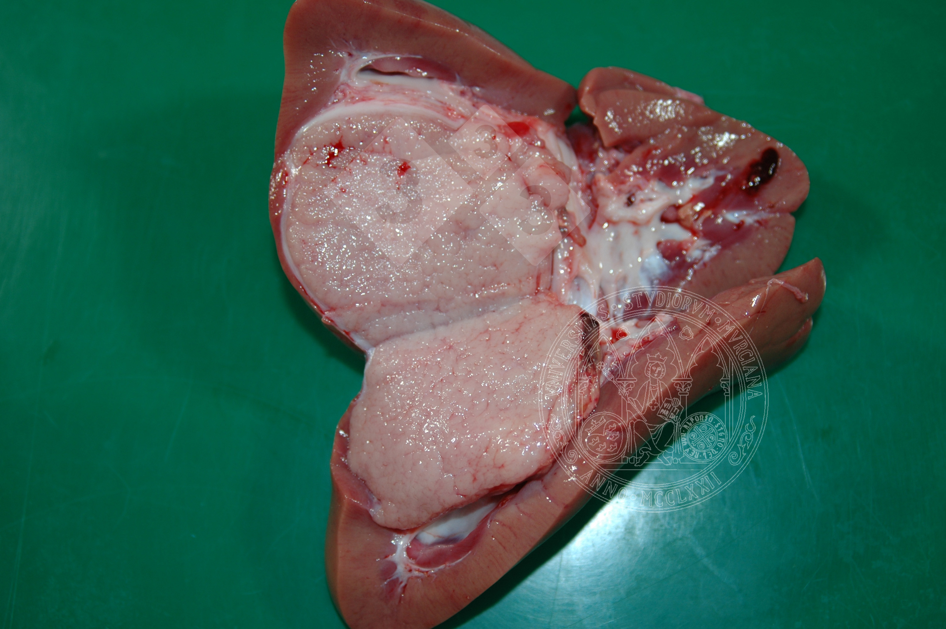 Observa-se uma massa arredondada de cor esbranquiçada no rim que ao corte tem um aspecto de banha. Trata-se de um tumor de origem embrionária denominado nefroblastoma. É o tumor renal primário mais comum nos suínos. Costumam ser unilaterais, ainda que, por vezes, possam ser bilaterais e nalguns casos podem dar metástases noutros órgãos como sejam o pulmão e o fígado.