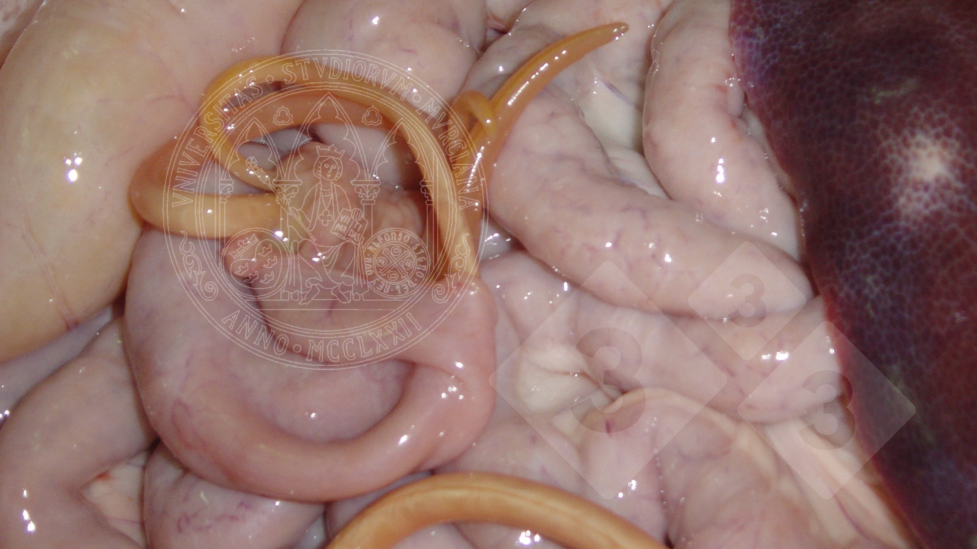 A foto mostra o intestino delgado de um porco de abate cuja parede tinha uma consistência muito dura ao tacto nalgumas das secções. No fígado observam-se manchas esbranquiçadas na superfície. Ao abrir as zonas do intestino que tinham consistência dura apareceram vários nemátodos, alguns com mais de 20 centímetros de comprimento. Trata-se de Ascaris suum e as manchas no fígado são "manchas de leite" produzidas pela migração das larvas deste parasita.