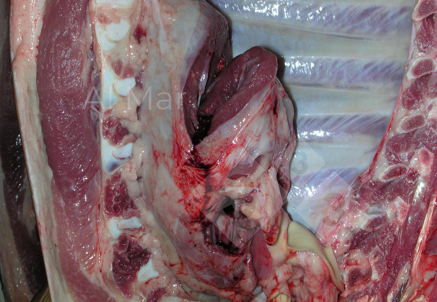 A lesão encontrada na cavidade torácica de um porco após o abate é uma pericardite com fibrose pleural crónica, ou seja, observam-se aderências do coração e do pericárdio e deste com a pleura.
