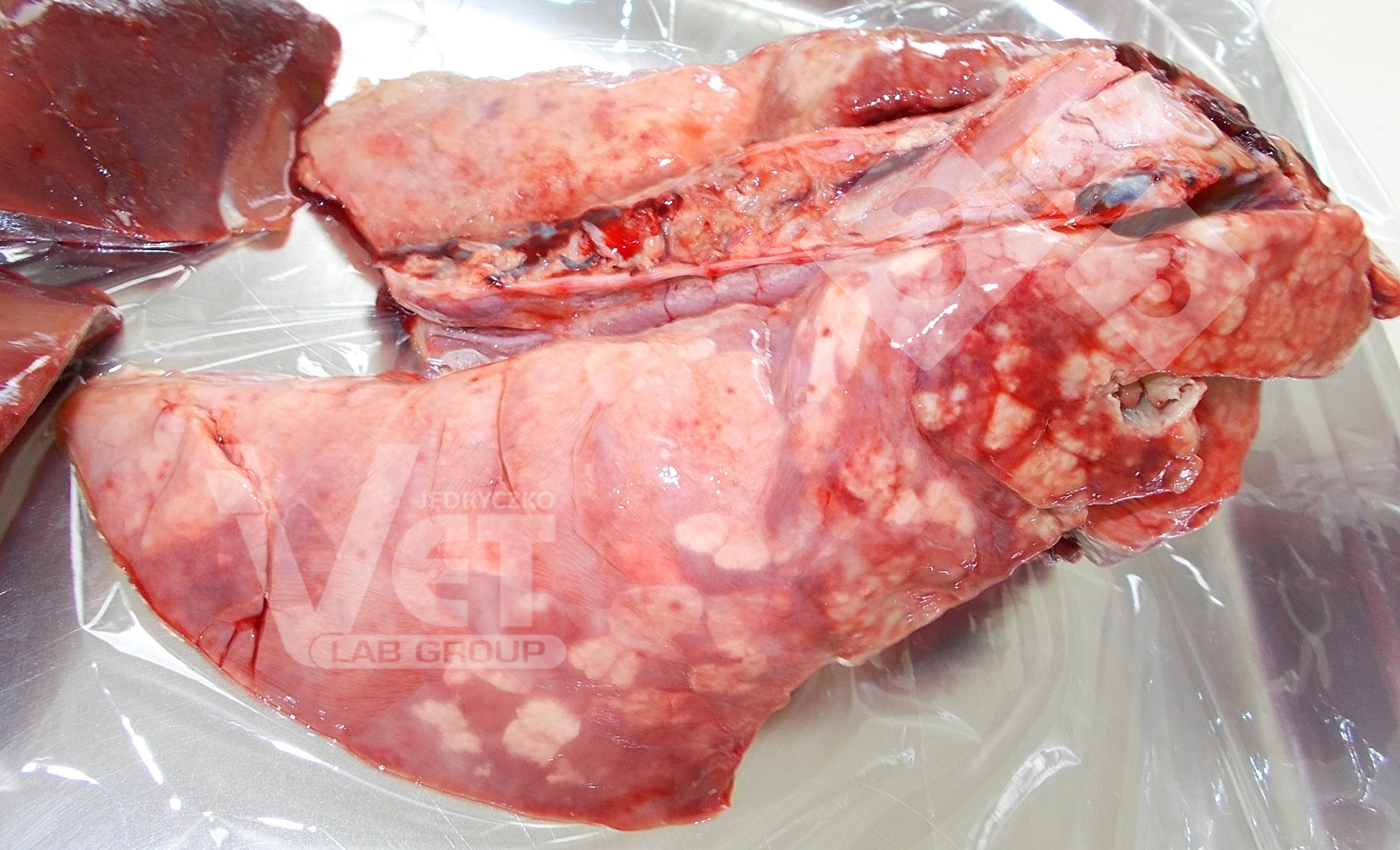 Estes pulmões apresentam alterações inflamatórias que, neste caso, foram provocadas pelo PRRSv. Os sintomas respiratórios, especialmente a dificuldade respiratória, observam-se principalmente em porcos na primeira e segunda fase de engorda. Podem ser acompanhados por anorexia, sonolência, febre, conjuntivite, edema palpebral e descoloração do focinho e das orelhas. A infecção pulmonar por PRRSv aumenta o risco de infecções secundárias (p.es. Pasteurella multocida, Trueperella pyogenes, Streptococcus suis). Numa exploração, a doença pode aumentar as perdas e o crescimento desigual dos grupos de engorda.