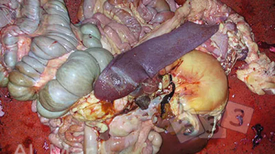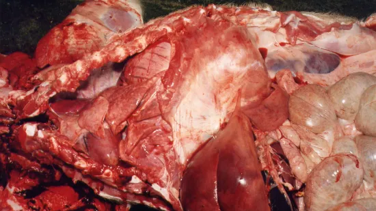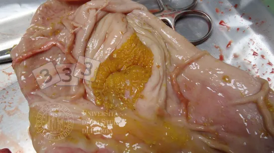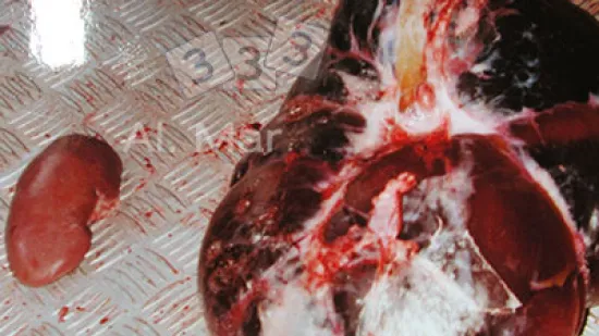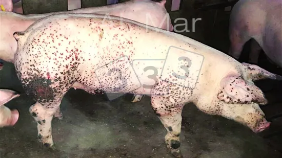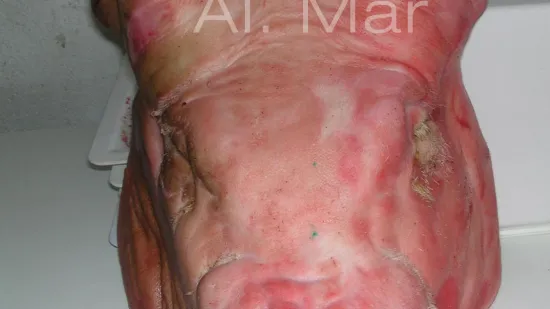 Qual é a causa desta lesão na extremidade anterior do porco?