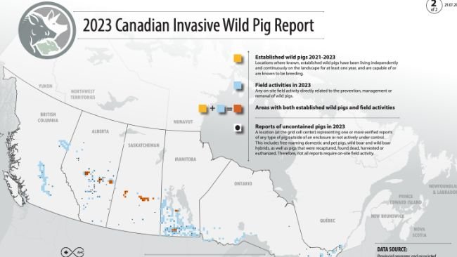 O relatório mapeia as localizações de javalis selvagens e as atividades provinciais de prevenção, gestão e remoção.